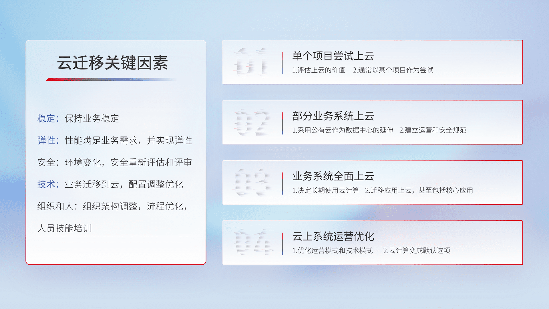 结合实际业务,,从规划设计、、、云平台选型、、、云原生改造、、、数据迁移、、集成交付,,迁移全过程为客户识别最佳上云路径,,,做好风险识别管理,,,设计网络架构、、、、身份权限、、、、安全审计合规、、操作审计、、日志审计、、、、监控告警策略、、多站点容灾设计等,,,对云上基础设施进行整体规划,,,,提升IT治理水平,,,以满足弹性、、、、高可用、、高性能的需求。。